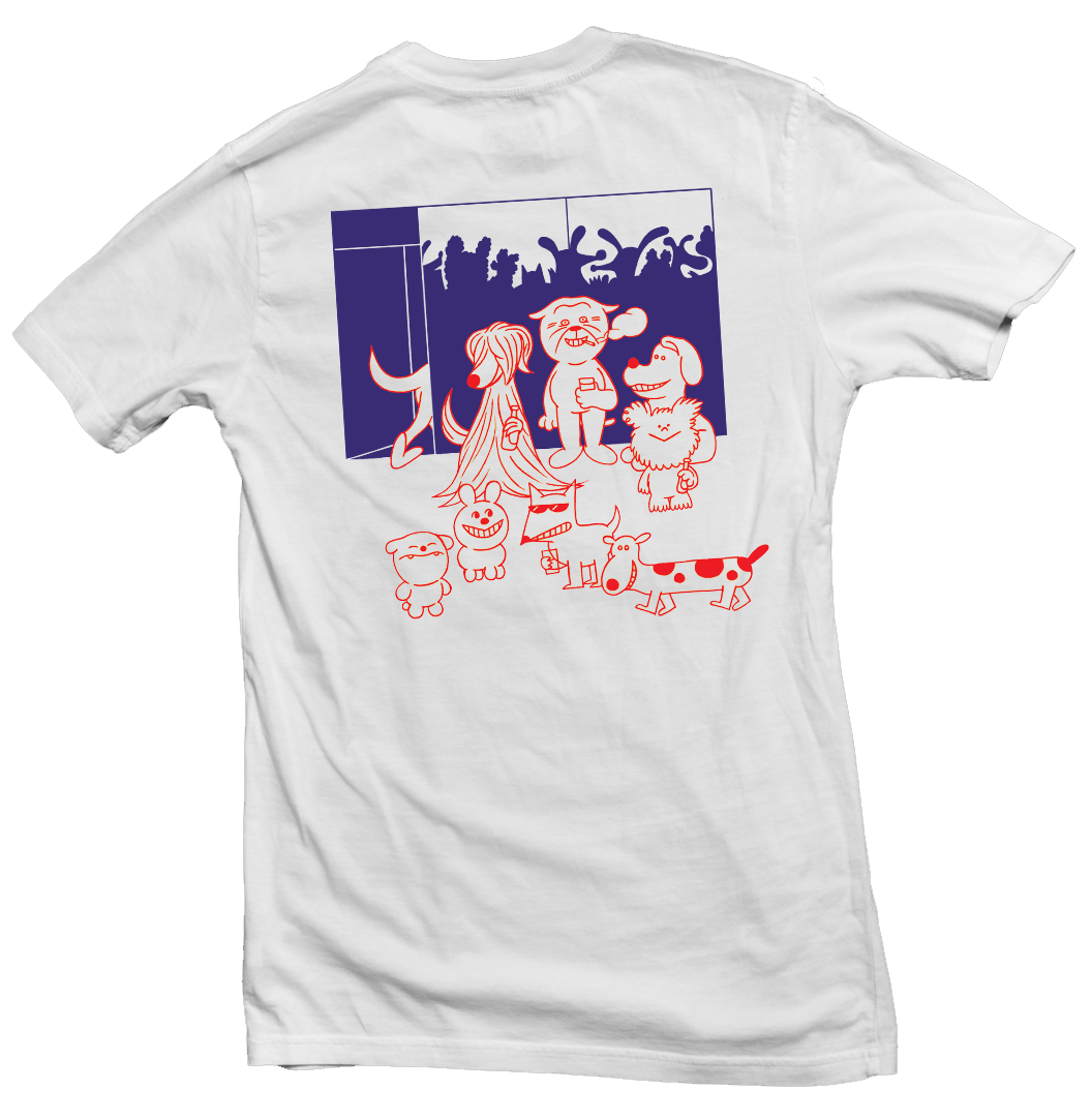 Screen printed T-shirt with hand-drawn illustrations by cartoonist Richard Short, inspired by late night house parties at brilliant corners. High quality heavyweight 100% organic cotton in a relaxed fit. Limited run.